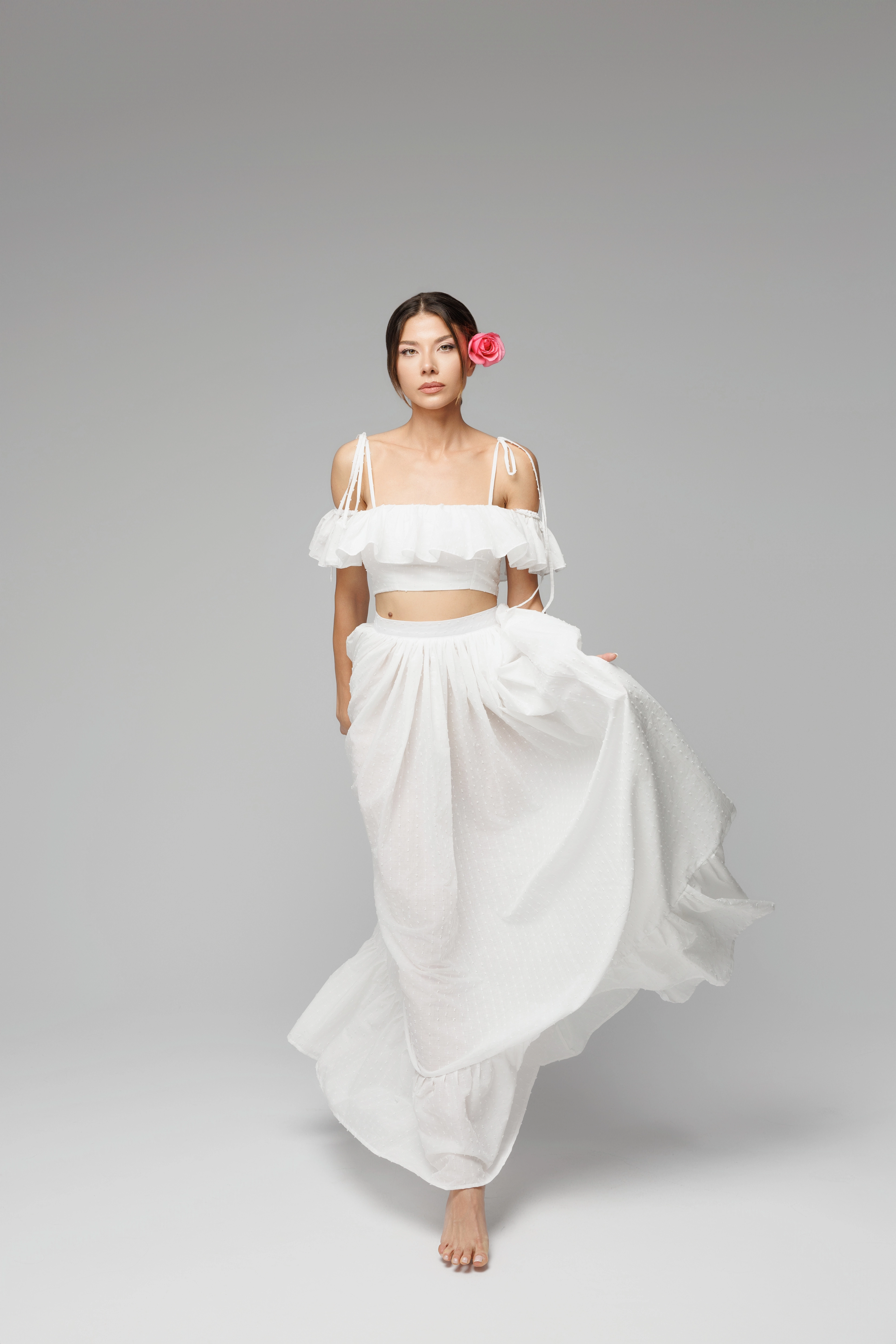Set format din top scurt cu volane ample și bretele ajustabile și fustă lungă vaporoasă cu elastic în talie. Realizat din bumbac plumeti alb, cu o textură delicată și romantică, acest ansamblu este ideal pentru zilele calde de vară, plimbări pe malul mării sau un eveniment boem în aer liber. Ușor, feminin și spectaculos.